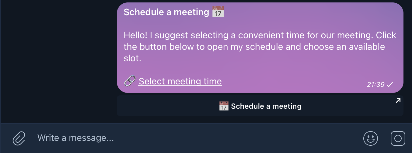 1. Open Telegram and in a group/chat with the person you want to invite to a call, type **@flymeetbot** and **space**;&#x20;