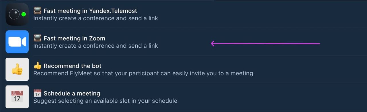 3. In the pop-up list, select the desired action **"Quick meeting in Zoom"**